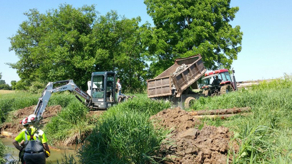 The man driving the tractor, who is also the landowner, is Mennonite and borrowed the dump trailer from a neighbor for the project. The Union County Conservation District Pennsylvania Fish and Boat Commission and Pennsylvania Department of Environmental Protection are working to through the Northcentral Stream Restoration Partnership to stabilize the streambank.