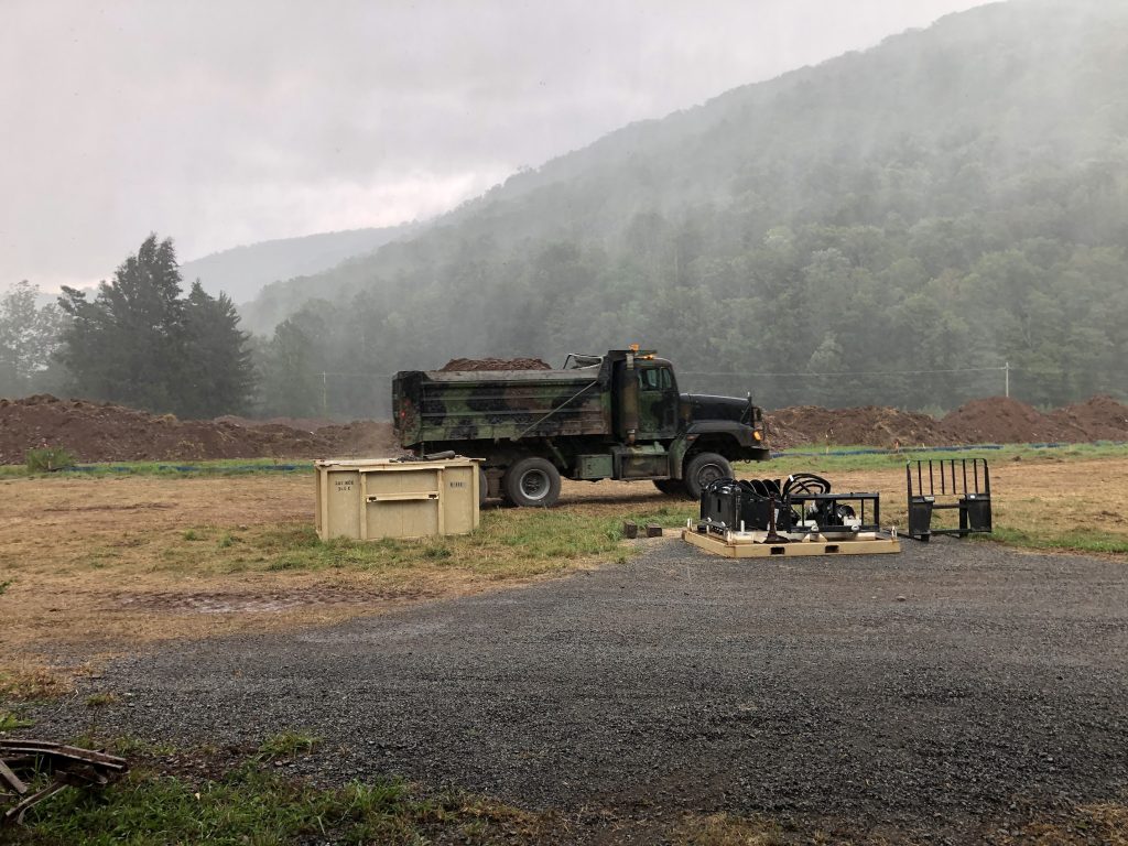 The material from the berm is going one of two places. Some of the material is being hauled by the soldiers up to a road project on Camp Mountain Road. Material will also be stockpiled on the farm site for future by the Game Commission.