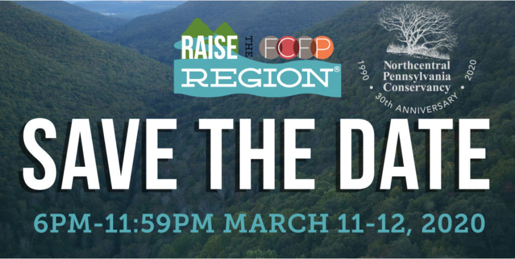 • Get ready to give! You can help NPC surpass our goal of $5500 by donating during the campaign.  On March 11 – 12, starting at 6PM on March 11, visit www.raisetheregion.org and make a donation to Northcentral Pennsylvania Conservancy. You will have 24 hours to make your donation, and all giving will end at 11:59PM on March 12.