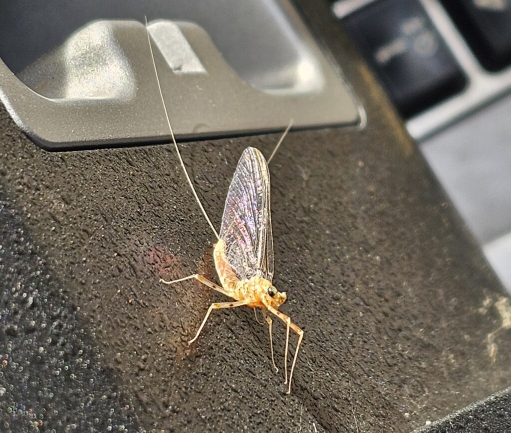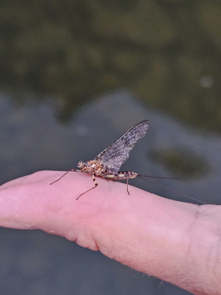 Mayflies are a favorite food for trout and have a brief adult lifespan, often living just a few hours to a day. They have delicate wings and long, slender bodies. Their nymphs are flattened and have gills along the abdomen. They are good indicators of water quality because they are sensitive to pollution and require clean-oxygen-rich water to survive.