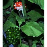 • On the forest floor, the red berries of the jack-in-the-pulpit (Arisaema triphyllum) are easily seen.  These showy, bright red berries have the consistency of a ripe tomato, and are an attractive food source for birds such as thrushes, rodents, and other small mammals.