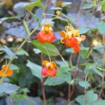 • Early and mid-summer blooms are fading, so the hummingbird is searching for new sources of nectar.  Fortunately, jewelweed (also known as spotted touch-me-not) is in bloom and its flowers are the perfect shape for the hummingbird’s long beak! And of course the hummingbird isn’t just taking and not giving – it’s serves as one of the main pollinators of jewelweed.