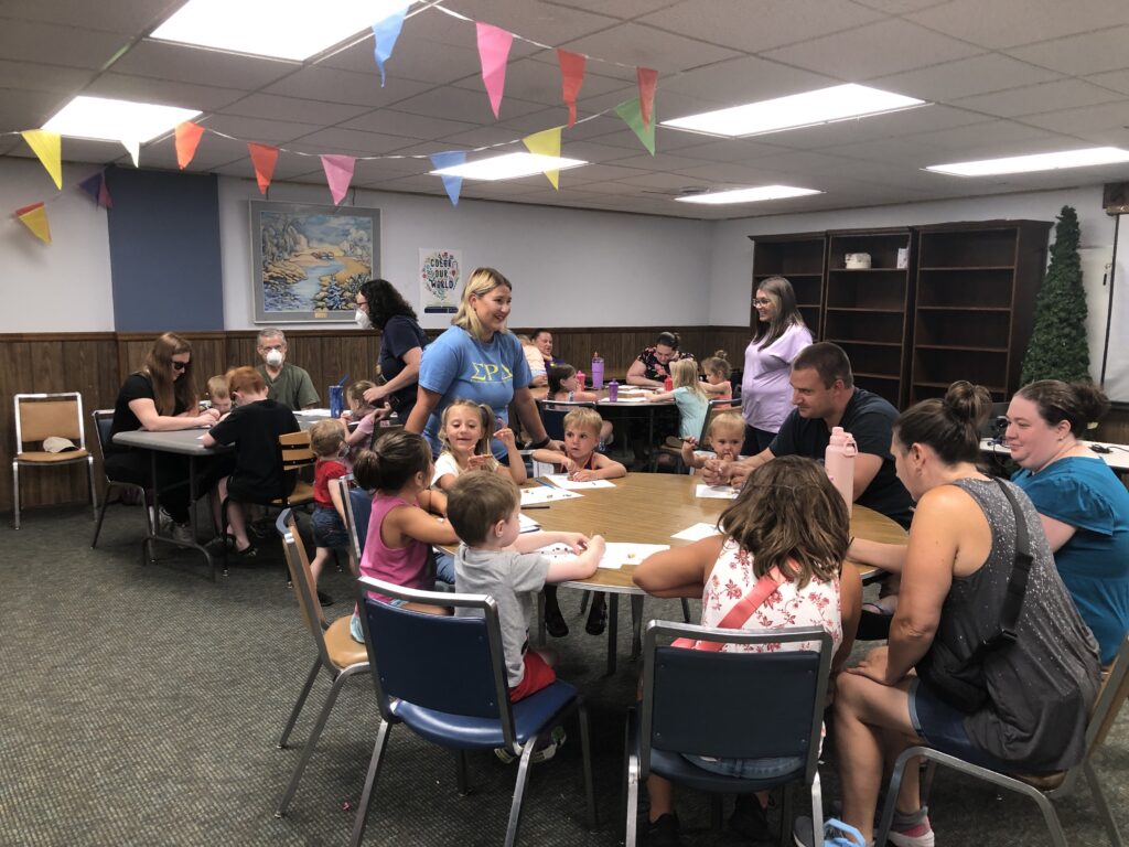 Erica and Maddy from the Tioga County Conservation District help out at the Tie-Dye Party held at the Blossburg Memorial Library.Inside, NPC staff, Sara and Jesse, lead participants through a macro-matching game while waiting for their turn to tie-dye.