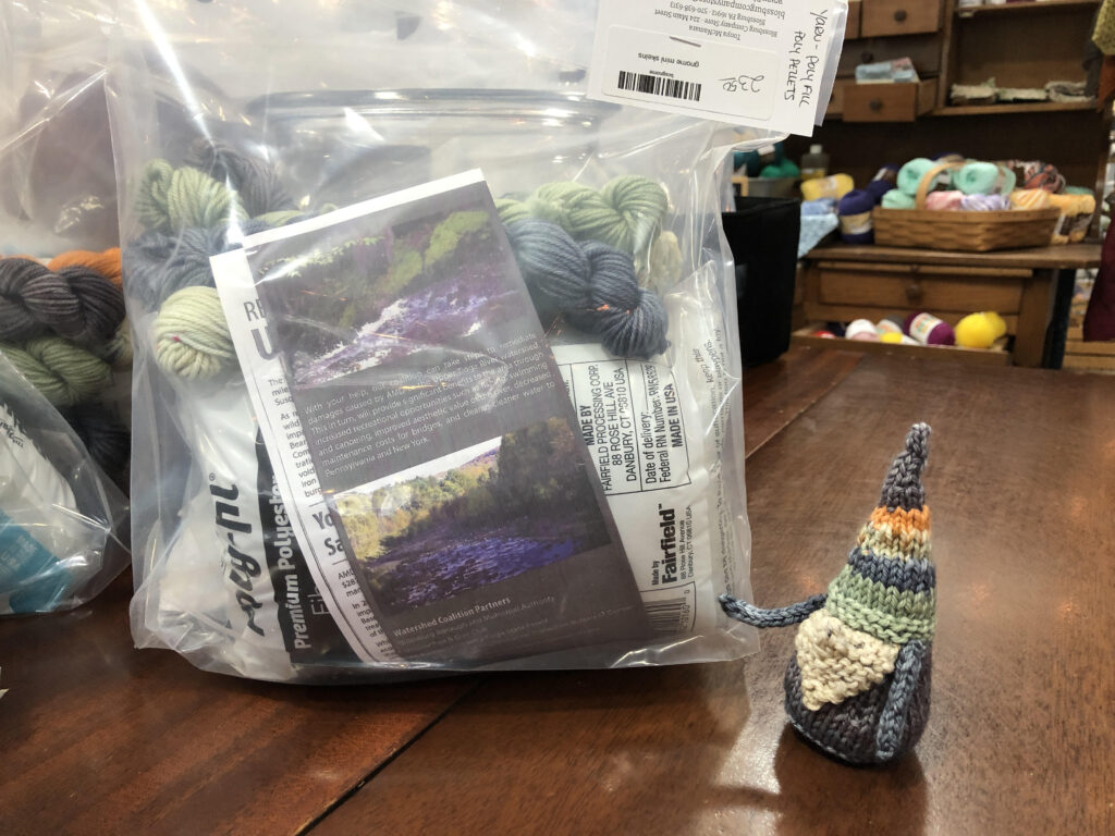 Gnolli checks out the Make-A-Long kit, featuring yarn from the Blossburg Company Store! Each color tells part of the Tioga River’s story, from polluted past to a brighter, healthier future.