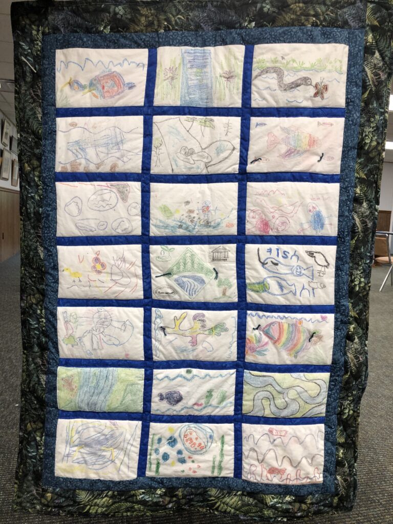 The community Water Quilt hangs on display at the Blossburg Memorial Library.