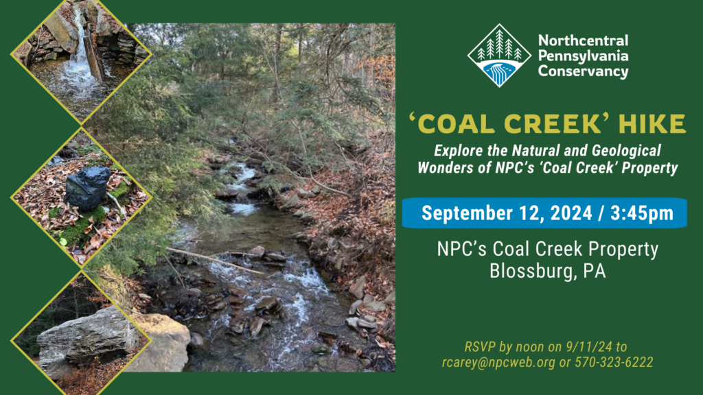 Join the Northcentral Pennsylvania Conservancy (NPC) for a special public hike led by Julie Weaver, a geologist, former science teacher, and member of NPC’s Board of Directors. This hike will take you through NPC’s Coal Creek property, a site rich in both natural beauty and geological significance.