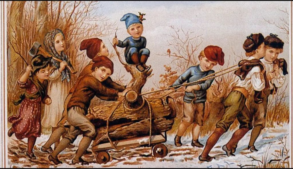 Trees have historic ties to December celebrations. Yule logs were first used by the Vikings during the winter solstice. A tree was cut in the woods, runes carved into the tree, and the tree then drug to the home fireplace. The cut end, the wide end, was put in the fireplace and the yule log was then burned for 12 days. The concept traveled to other countries with the Vikings and then with cultures influenced by the Vikings and you’ll find variations across the globe.