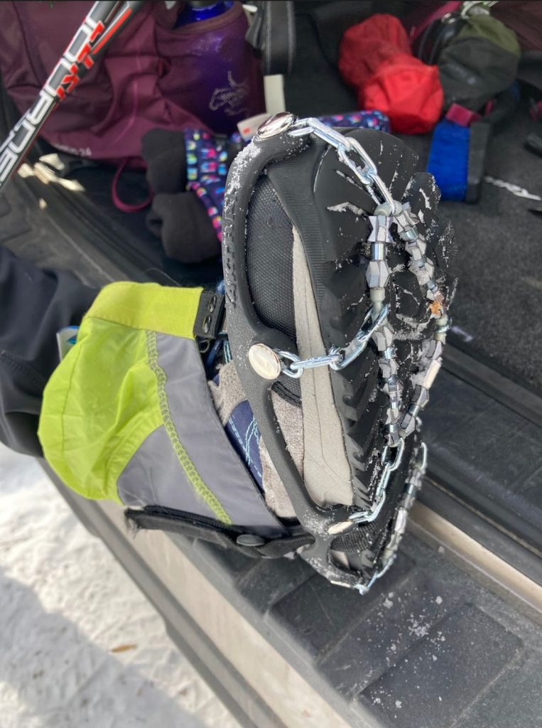 Winter can be a great time to walk in the woods. The snow and ice and cold need to be considered but can be overcome. A traction system for your shoes can be one way to make your wintering outings in the woods safer. There are a variety of brands out there, but most of them pull onto your boots and use chains, springs, and pieces of pointy metal to help you get traction on slippery snow and ice. While it’s almost the end of February, the snow and ice can hang on in shaded areas in the woods.
