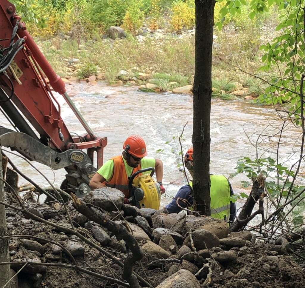 The structures are built out of logs and rock. The logs are held in place with rebar and rock provides weight to hold the logs in place, and also provides a surface to regrade to create a sloped riverbank. A sloped riverbank allows higher than normal flows to move up the riverbank and spread out. This will slow down the water which further reduces erosion at the site and downstream.