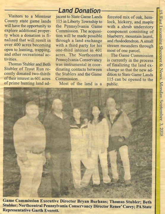 After several meetings with the owner of the remaining one-third interest, the Pennsylvania Game Commission realized it would be most efficient for them to work directly with Tom and Beth on the donation instead of NPC receiving the donation from Tom and Beth, then working with the other landowner, before finally conveying the acreage to the Pennsylvania Game Commission.