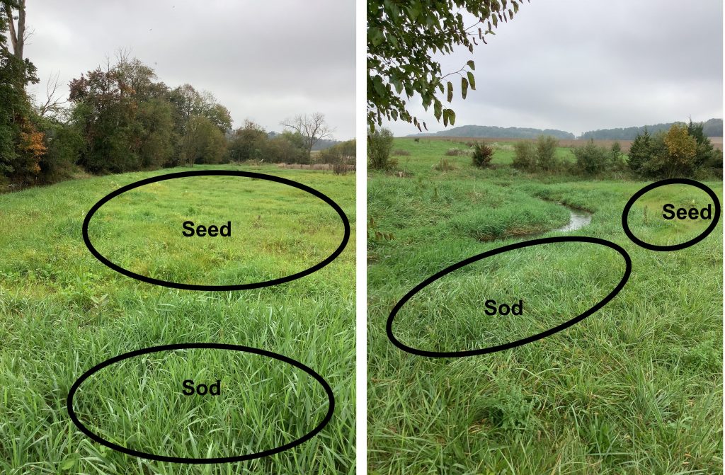 In the photo ont he right, you can see the grass seed is trying to establish and off to a good start, but it’s not “thick” as the existing sod. The roots below the surface only get as deep or long as the vegetation on the top. The shorter the grass, the shorter the roots. Short roots don’t hold as much soil and long roots.