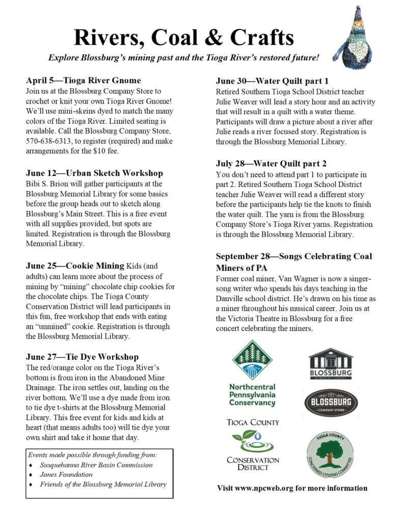The series – coordinated by NPC, Tioga County Conservation District, and the Blossburg Memorial Library – celebrates the Blossburg community and shares information about the Tioga River’s ongoing restoration.