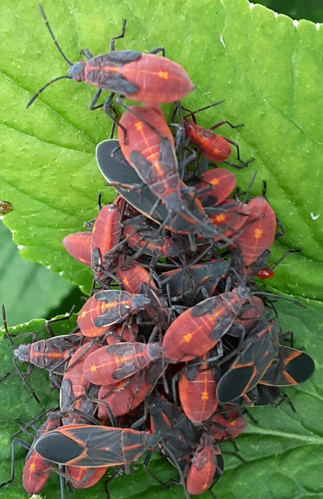 I was surprised recently by a large amount of insects sitting on the leaves of some Great Lobelia plants. Maybe “amazed” would be a better word for it. There were a lot of them. I needed to identify them and learn why they were gathering there. Here’s what I learned – they are our native Eastern Boxelder Bugs. Considered “true” bugs because adults have piercing, sucking mouth parts and a characteristic triangle shape between the tops of their leather-like wings. The younger bugs with them are nymphs with bright red bodies, black antennae and legs. You can find them easily in the photo because they are the ones with small slate gray or black patches on their backs. These are their wing buds. When the nymphs emerged from eggs, they were only 1.3 mm in length. (There are 25.4 mm in an inch.) So tiny! Because they are invertebrates, or animals without backbones, they are held together, supported, protected by an exoskeleton made of chitin. It is stiff and hard. When the nymphs begin to grow, they must shed and replace that rigid exoskeleton with a new larger one in order to get bigger and attain adulthood with sexual organs and wings. They need to molt five different times, becoming darker red as they mature. The red V on the back of an adult is created by its folded wing edges. The other, larger red marks on their bodies may serve as a warning to predators that they are distasteful because they contain a pungent, bad-tasting compound. Preying mantis and spiders eat them anyway. Few birds will eat them. They sun together in large groups on warm surfaces. All of that red in one place probably serves to keep hungry predators from munching on them.