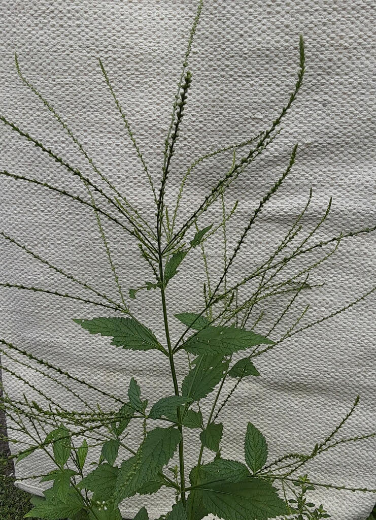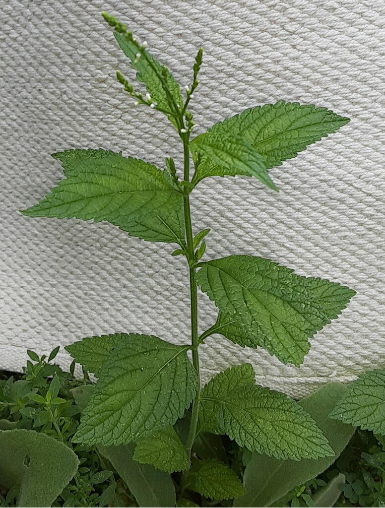 Young White Vervain plant. My husband held a rug behind it as contrast in order to show its short flower spikes at its top.