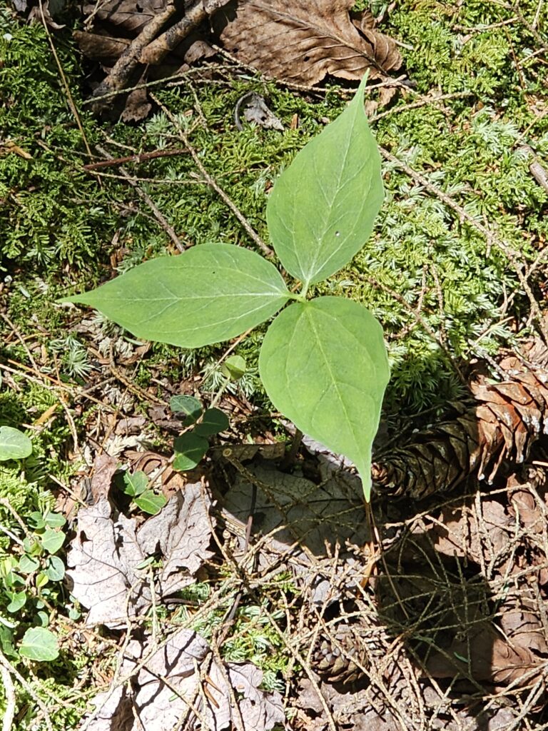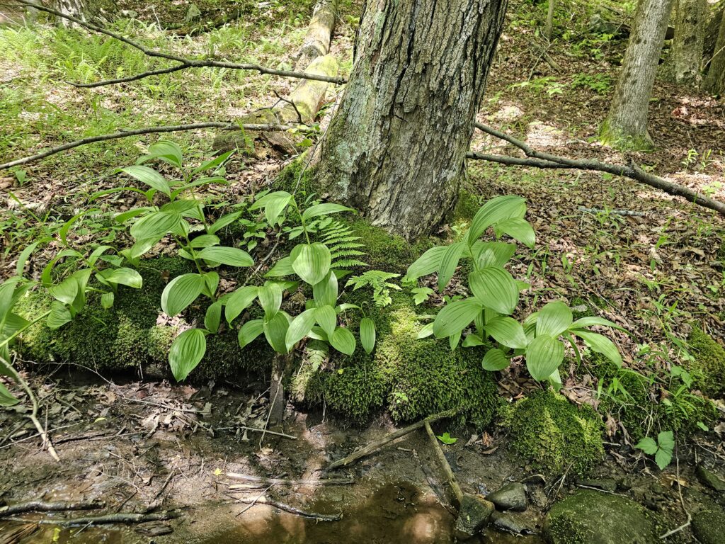 The trillium here is not in bloom, as their blooming season has ended. It is still important to note their appearance, to not disturb this sensitive, slow growing, native plant.