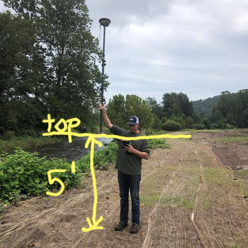 Trent is holding the survey rod “on top” of the berm. The bottom of the staff is resting where the top of the berm once was.