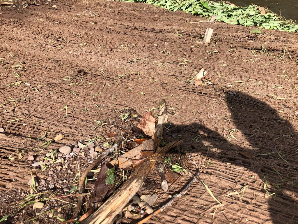 We wanted to see if there was flood debris that would need removed. This tree branch got caught up on the wooden stakes used to hold the jute mat in place (technically it’s a coconut fibre woven in to a grid).