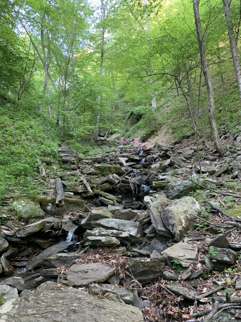 Following the Lower Road, you’ll make a moderate incline into the woods, followed by a gradual decline to Butternut Run, a small, intermittent stream with numerous cascades.  Along the way you’ll pass several springs and enjoy a bird’s eye view of the Loyalsock Creek.  When you reach Butternut Run, be prepared to cross on foot as there is no bridge.  As you’ll see below, the stream was slightly more than a trickle on Aaron’s hike, but after a heavy rain this section of the trail could be tricky!