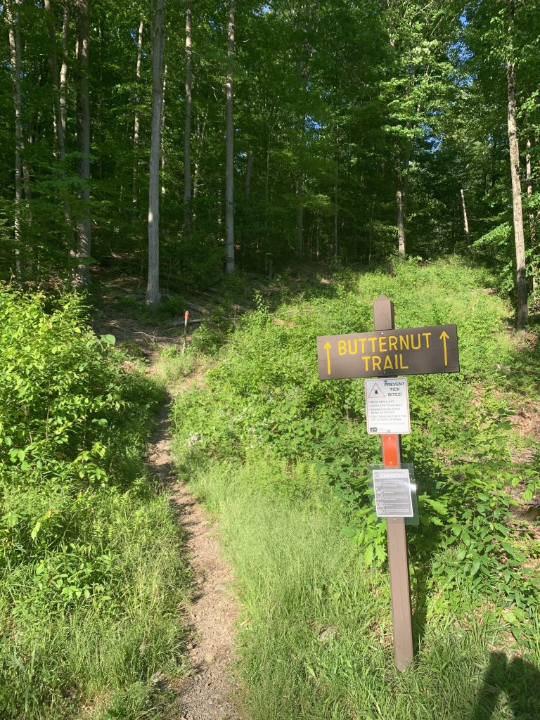 The 2.5 mile Butternut Trail makes a circuitous loop through a northern hardwood forest. The trail originates shortly past the State Park Visitors Center on the east side of the Cabin Bridge. There’s a small parking lot on the left near the trailhead.