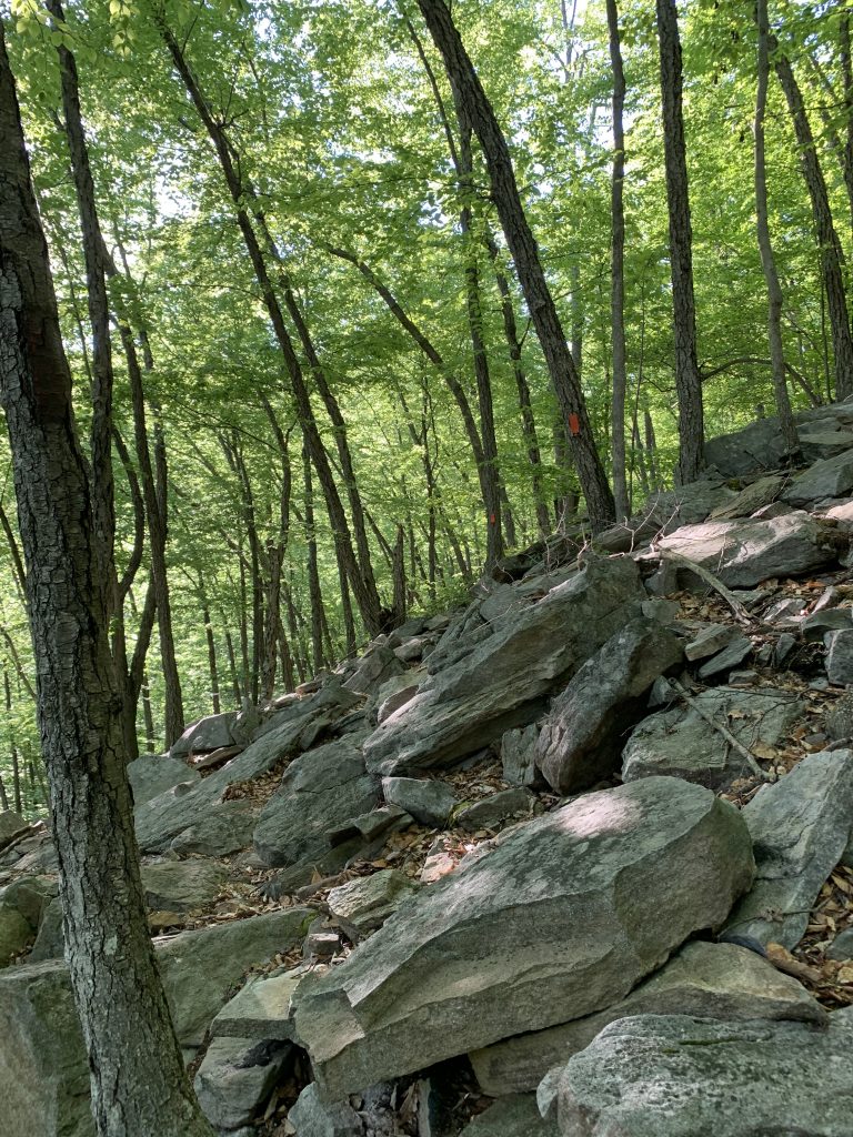 After crossing the run, the trail ascends again, becoming rockier, and following steep switchbacks.  Enjoy the unique rock outcroppings and formations along the way!