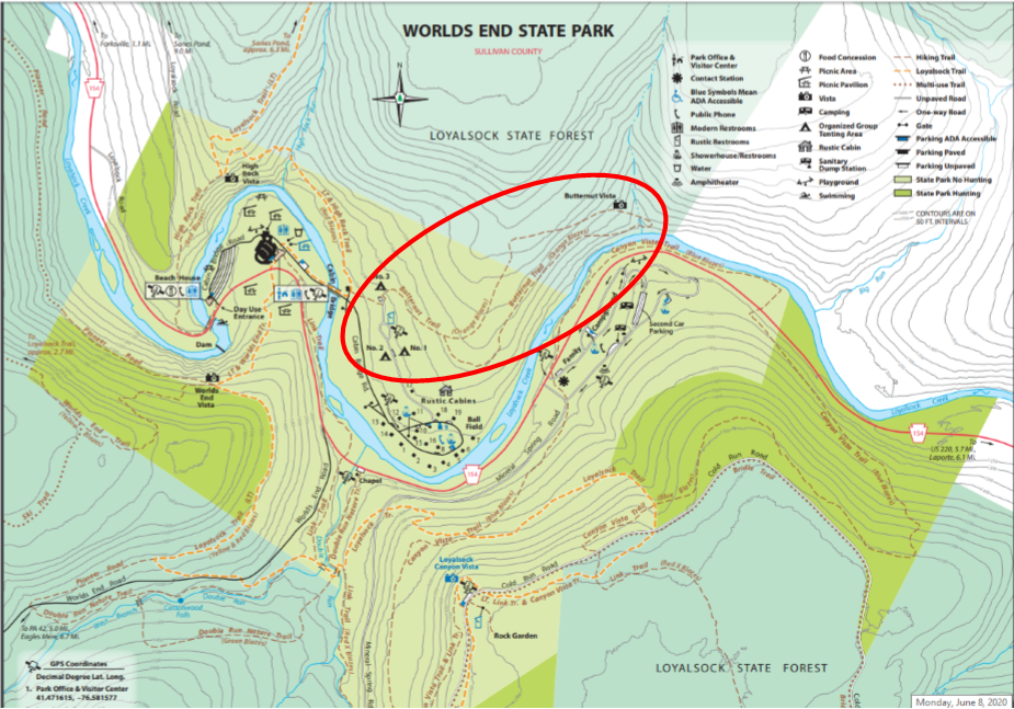 Circled above, the Butternut Trail on the Worlds End State Park map.