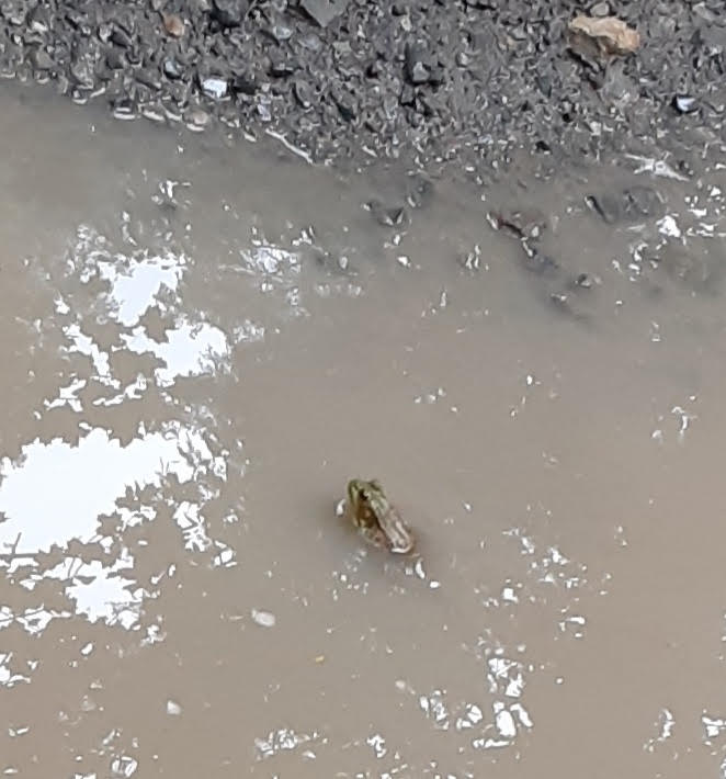 Aaaah! It was definitely “Spa Day” for the Green Frog we carefully passed. The spa puddle took up most of the road, but he or she did not flinch a bit as the waves of our passing went by. It was a good, wet day in the neighborhood there! The green upper lip, the large eardrum, and the prominent ridges on the side of its back give hints of the species even though it stayed submerged.