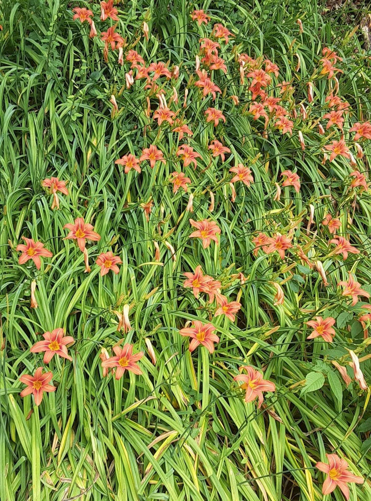 We saw hordes of fresh orange daylilies blooming everywhere. They will continue to provide us with new flowers until all their buds are used up. Here today, mostly gone tomorrow – droopy heads shriveled up and falling off.