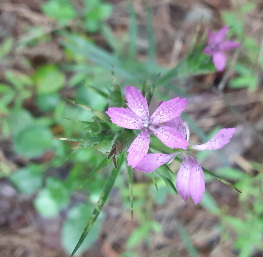 Deptford Pinks, small, pinkish-purple flowers with skinny leaves lent a bit of color to the fresh green of happily watered plants. This flower may have originally been found growing in Deptford, SE London! It has since been extirpated in England.