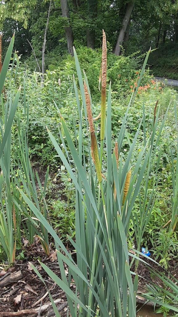 Cattails in a roadside ditch! I like seeing them all dressed out with both types of flowers showing. The top, staminate ones, provide the pollen for the lower pistillate ones that will make the seeds – lots of seeds. I bet you have seen them as they ”fluffed out” during the fall and wintertime, sending their seeds in furry bunches to waiting wet areas.