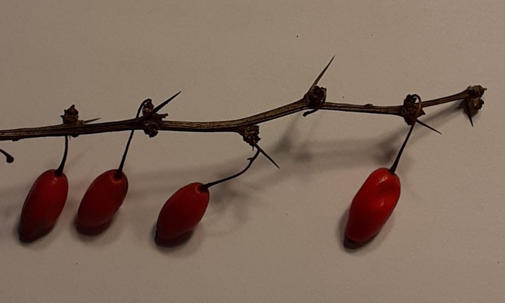 Just because barberry is considered a noxious weed in some places doesn’t mean it hasn’t had a long and interesting history of usefulness to mankind. The ancient Egyptians used it in a syrup with fennel to prevent the plague. Dried and fresh roots were used to make a colorfast yellow dye for cloth, leather, and wood. Berries were made into jams and jellies or without sweetener, provided an acidic kick to the taste of salads. Berberine, a constituent of these plants, actually fluoresces under ultraviolet light, making cells under a microscope easier to study. It is used in medicines for everything from heart failure to burns and eye infections. Can’t judge a plant wholly by its aggressiveness!