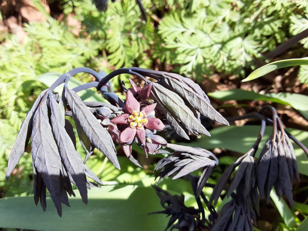 Its fragrant two-spurred flowers are pollinated by bumblebees whose proboscis unlike that of a honeybee is long enough to reach the nectar. Years ago I took one plant growing near a friend’s cabin and planted it under our big maple. Its progeny now carpet that area in