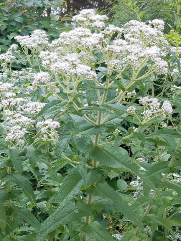 Boneset or Thoroughwort is a native perennial plant standing about 60 inches tall. It can be found growing in moist areas from Canada to Florida, and west to Texas and North Dakota. With a flat-topped cluster of 15 to 20 florets of white feathery blossoms at the top of its hairy stem, it may resemble a lot of plants blooming now. But, one of the totally cool things about Boneset is its long, lance-shaped leaves, a characteristic reflected in its species name perfoliatum. Leaves on the opposite sides of the stem grow together so the stem looks like it has pierced through them…perfoliate…through the leaves!