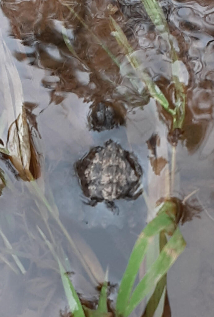 It did not have to learn hard lessons on the way to water: nest predators (minks, weasels, skunks, raccoons) nor wayside predators (dogs, crows, motor vehicles). In the water, other predators (bigger turtles, fish, and snakes, herons from above) will provide much needed life lessons.