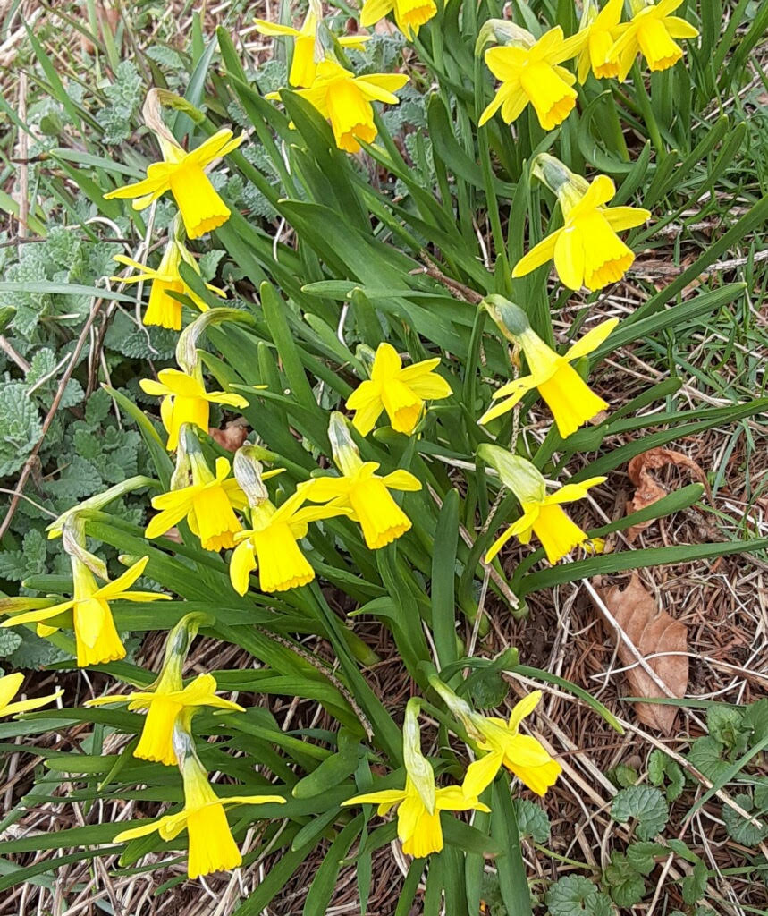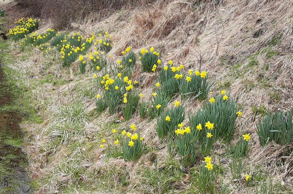 Daffodils are in the genus Narcissus. Folks seem to use both names interchangeably. Botanists who studied them have changed their family name and identified a whole bunch of species and cultivars based on frilly-edged or smooth, center coronas like bowls or trumpets, with the same or contrasting colors, having multiple flower stems. Yikes, our daff-o-down-dillies are pretty complicated! And pretty looking, but definitely not for eating. Even deer don’t like them. They contain lycorine, a bad-tasting alkaloid, but good for medical science that has found promising uses for its anti-bacterial, anti-viral, anti-cancer and anti-inflammatory properties.