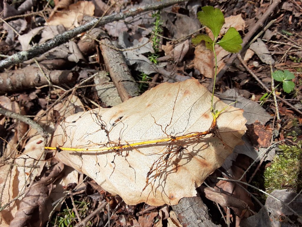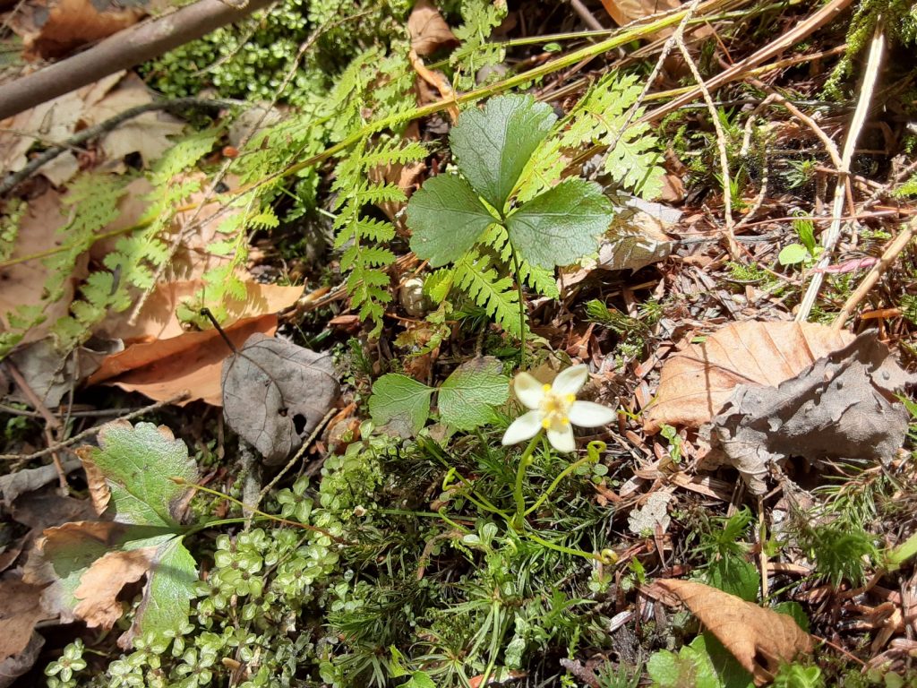By gently teasing apart the moss it is growing in, you can find bright yellow rhizomes which explain its common name. Single, erect stalks carry a single, star-shaped white flower with five to seven petals. People used to make a gargle for sore throats and mouth ulcers out of this plant because it is very bitter and astringent. And that gave it another name, cankerroot!