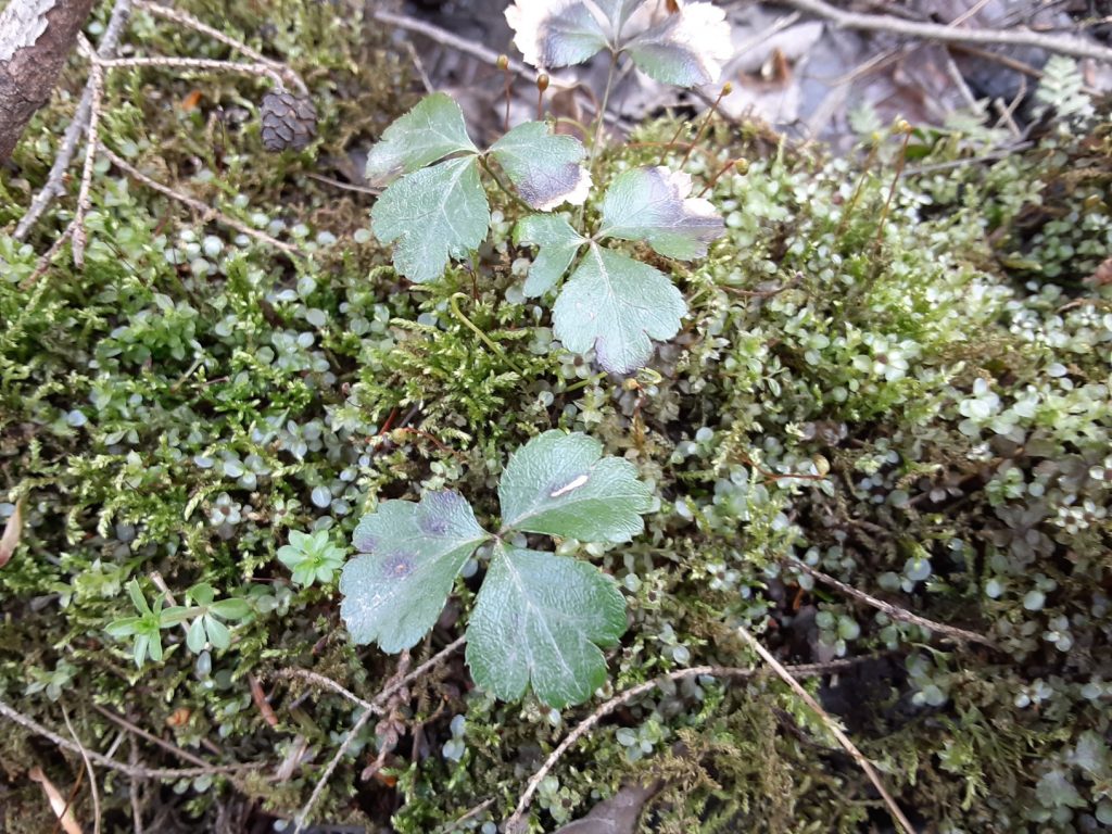 Exploring along the roads near Canyon Vista in Sullivan County, you can find lots of bogs – large hemlock trees above and mossy rocks and logs below. I found goldthread growing there, woven in amongst the moss. It is low-growing with three leaflet evergreen leaves that make it look like a miniature buttercup plant. They are both members of the same Ranuculus or buttercup family.