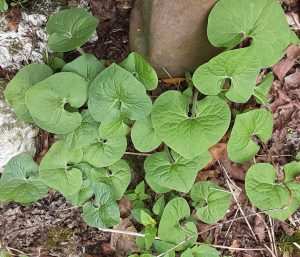 This native plant is found in the rich soils of shady, moist woods and floodplains. A colonial perennial, it grows low to the ground and puts out double heart-shaped leaves that are about five to six inches across.