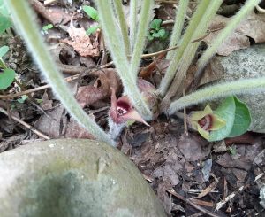 One of its identifying characteristics is a brownish, bell-shaped blossom, hiding down under its leaves. You have to dig down through the old leaves and forest duff to find it blooming low between the woolly leaf stalks. It is well camouflaged at only an inch wide with three pointed lobes. Check out the creeping rhizome from which the plant grows.