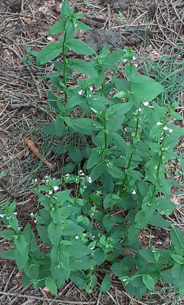 The simple leaves of Indian Tobacco can be hairy on both sides. They grow alternately on the plant stem that can be hairy, too. They are oval and range from 1 to 2 1/2 inches in length. Another feature that may catch your eye is the leaves’ toothed edges that have white dots on them. Surprise! I do not know, maybe it is the plant’s milky sap oozing out the tips.