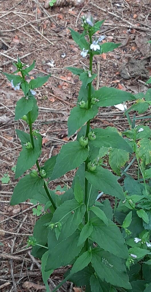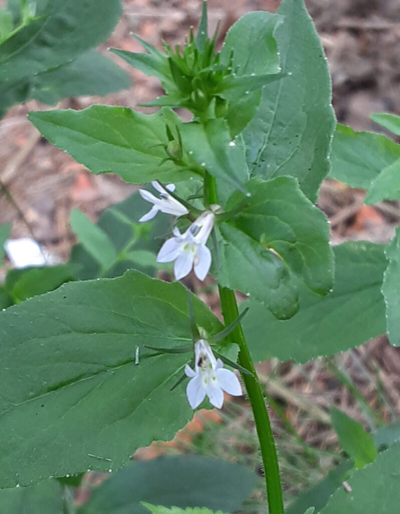 Indian Tobacco is definitely not showy like its two-to-four-foot-tall bright red relative Cardinal Flower (Lobelia cardinalis) that decorates stream banks and wetlands. Or its three-to-four-foot-tall bright blue relative Great Lobelia (Lobelia siphilitica), a plant I wrote about in a previous post. All three are members of the Bellflower Family and have tube-type flowers with five thin, pointed lobes – two at the top resembling ears extending upward and three on the bottom edge sticking out like lower lips.