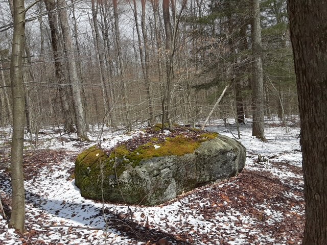 A huge bolder standing in a rather flat area of woods caught my eye on our Earth Day rambles. I knew it was a glacial erratic because there were no other big rocks nearby. Ripped out of its bed and plucked up by a moving ice sheet, it was unceremoniously dumped there as the glacier melted.