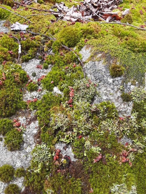 Thousands of years later, it has become a microcosm of lichens, mosses, grasses and trees. The non-living environment of the rock was a stable platform or substrate for lichens, typically the first organisms to colonize bare rock. Their physical and chemical processes dissolved minerals and built up soil as they lived and died. Mosses began living on the rock next when sufficient soil was available. Then came grasses and shrubs. Living and dying there, they provided more humus and soil to the rocky top.