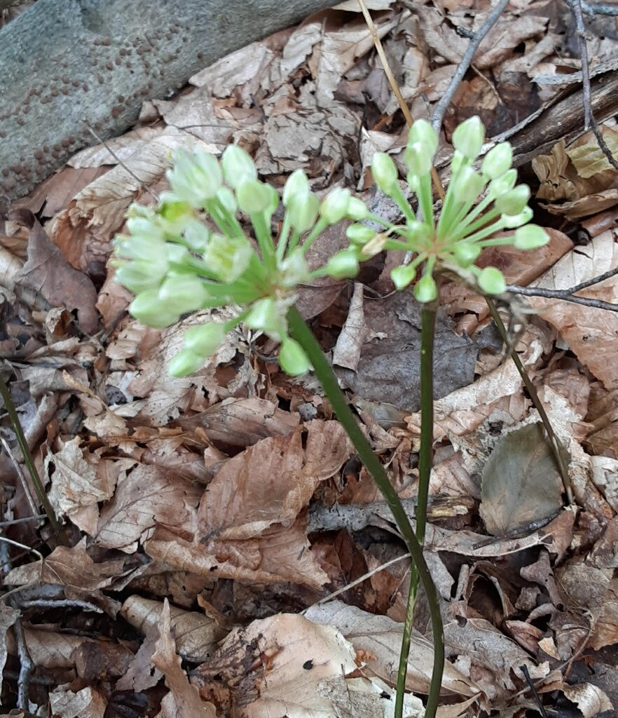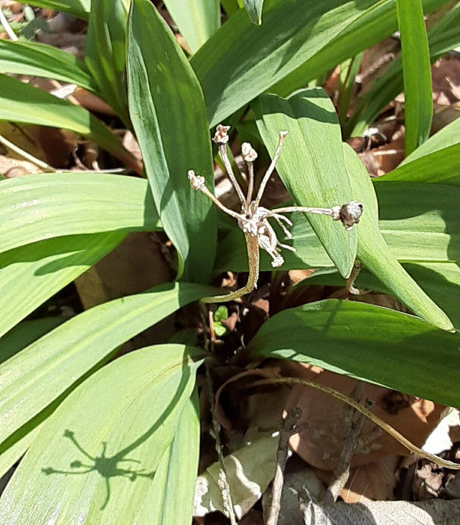 From a cluster of two to six white bulbs, they put up glossy, eight to ten inch-long, bright green leaves that photosynthesize like crazy in order to store energy. These flat, basal leaves are reddish on their lower stems, an important characteristic for correct identification. Their leaves begin to die back before flowering occurs. Soon after, a single round cluster, about 1 1/2 inches wide, and made up of white flowers, will appear on a smooth, leafless scape or stem. Each flower in the cluster will have six tepals (petals and sepals) and six stamens with creamy-yellow tips and a green ovary in the center. After fertilization, the three-lobed ovary will grow, then dry and split open, allowing small, black seeds to fall. The species name tricoccum comes from Latin for “three-seeded”. For a long time, I couldn’t put a name to this plant because first the leaves were there by themselves, and then the flowers were there by themselves. Finally, I figured it out!