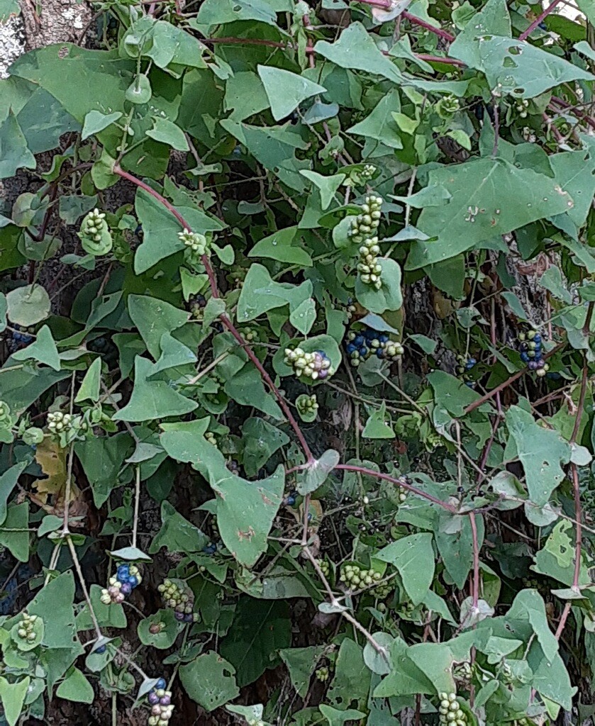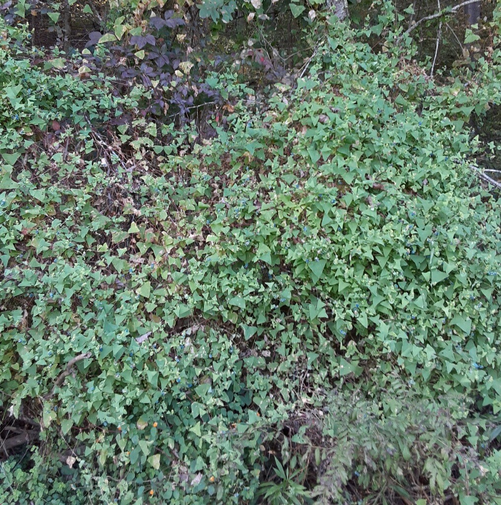 Look for Giant Climbing Tearthumb along roads, crawling and sprawling in thickets, and uncultivated open fields resulting from both natural and human causes. This member of the Buckwheat Family (Polygonaceae) loves the things we do to the soil – the digging, the clearing, the farming, the dumping – and will move right in. Another identifying feature of Asiatic Smartweed are its fruits which can be all different colors – green, blue, red – hanging together on the stem ends like tiny bunches of grapes. Since Persicaria perfoliata likes moist soils, too, you can find it frequently hanging over waterways where it will persist until after the first frost. Its pretty fruits are buoyant, able to float for up to nine days, providing another seed dispersal method.