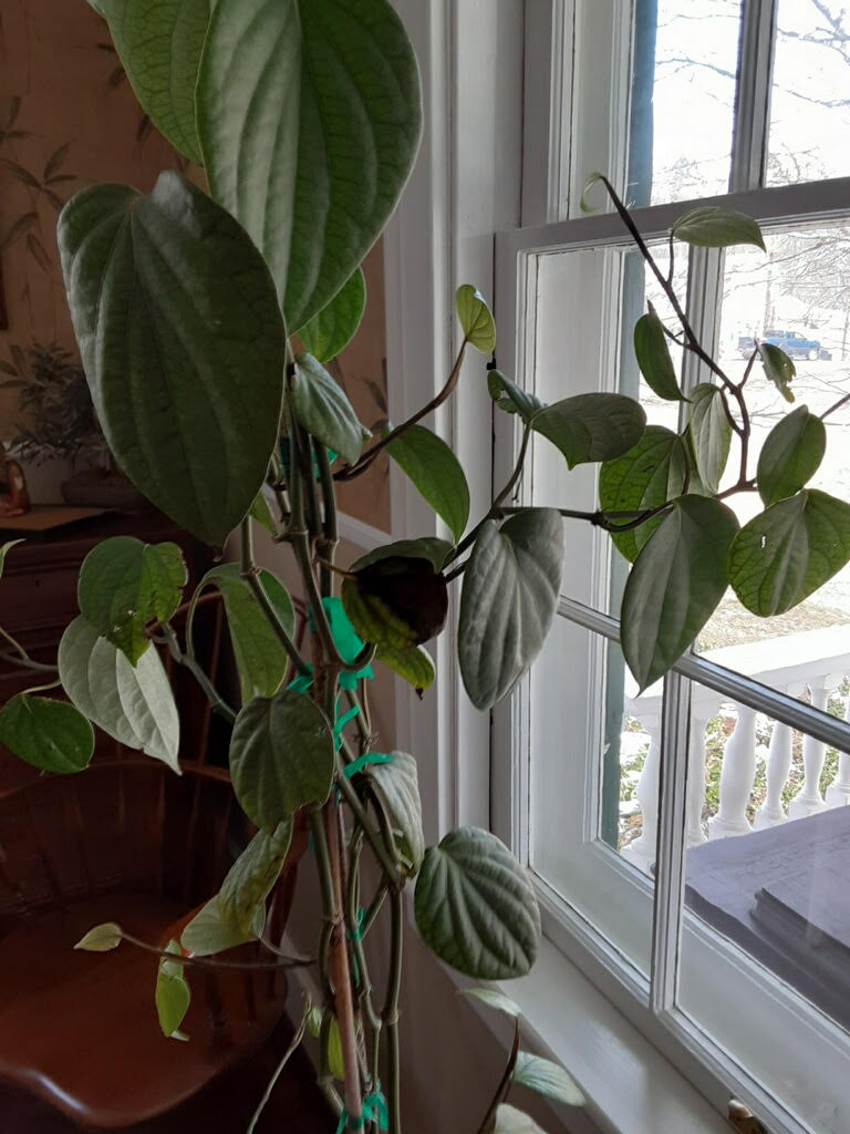A new vine came to live at my home this winter, brought from a much warmer clime. It is Piper nigrum, the Black Pepper Vine, the species of plant that provides us with over a million tons of pepper yearly. After growing up to 13 feet for about four or five years, a pepper vine will produce flowers on hanging spikes that turn into small pungent fruits, maturing from green to red to black. Picked while unripe, the berries are boiled and dried before being sent on their way from the twenty-five countries that produce them – the world’s most traded spice!