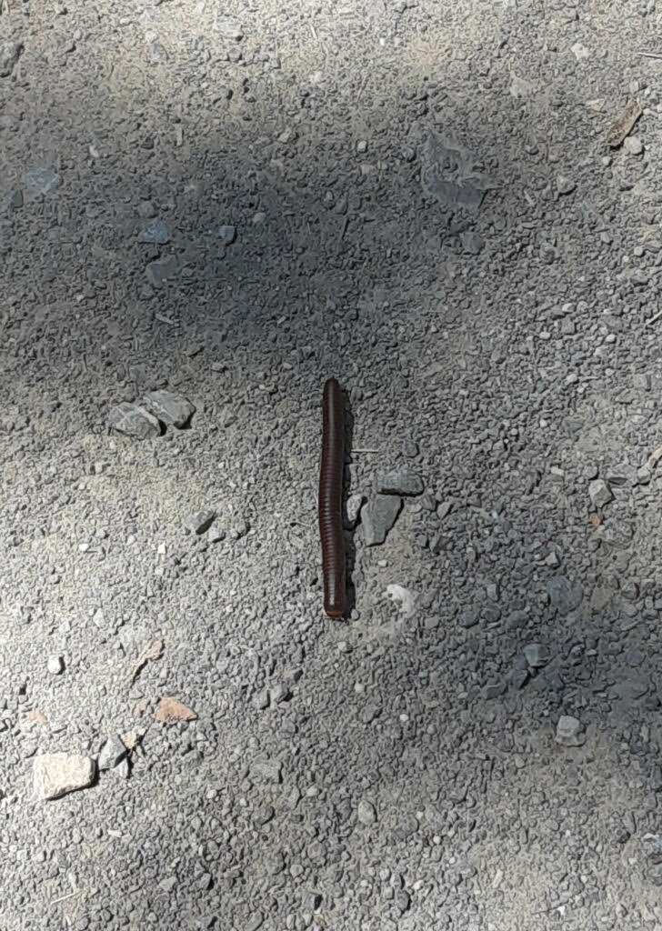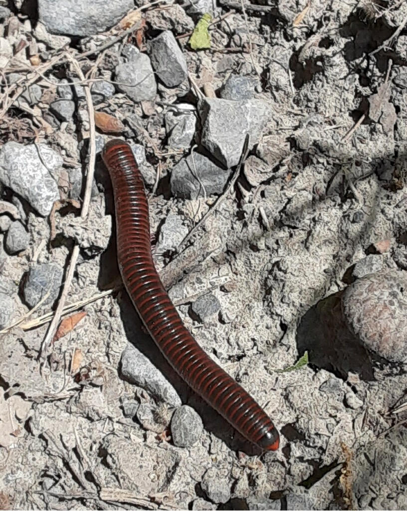 On the march, a three-inch-long millipede was crossing a dirt road in Ravensburg Park, going from the dry forest towards a creek bank. Its journey may well have been ended as a car came zooming towards it. My quick intervention moved this leggy critter, placing it in the roadside ditch that it appeared to be travelling toward. Millipedes are one of the first and largest air-breathing invertebrates (without a backbone) to walk on land some 420 million years ago and growing to six and a half feet long and a foot and a half wide. That fast car would surely have wrecked if it had run over one of those. What a speed-bump that would have been!
