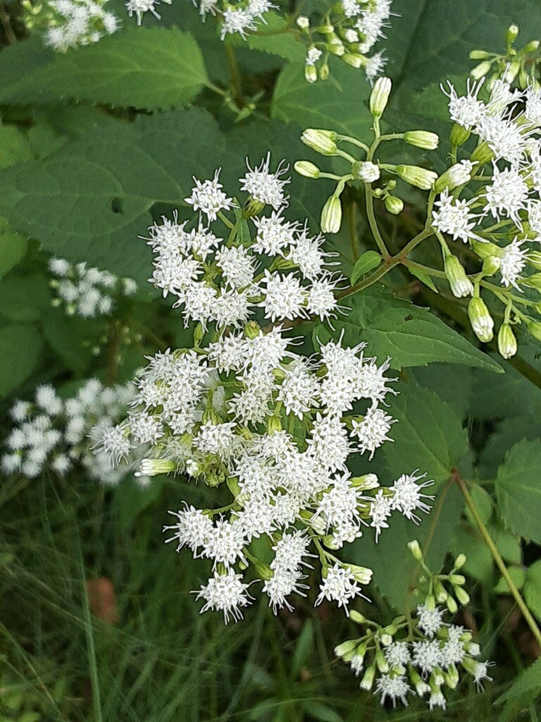 White Snakeroot is blooming now through October, depending on the weather. The heavy rain and hail last week may have taken a toll on their white, fuzzy-looking flower heads.