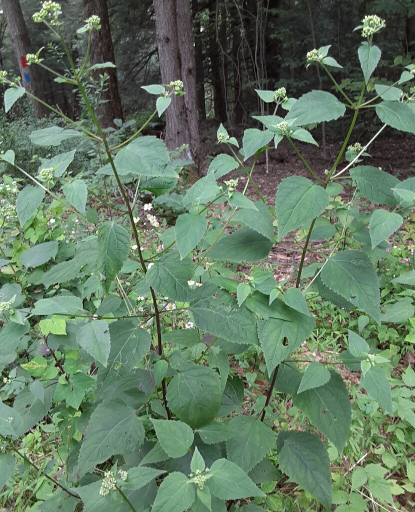 White Snakeroot is a native perennial plant with thin green to brown round stems. Their opposite leaves are oval-shaped and can be coarsely to sharply toothed. They flourish in deep shade to full sun and are common in woods, meadows, and along roads. The whole plant has a rather angular look to it with the flower heads jutting straight off above the leaf pairs!