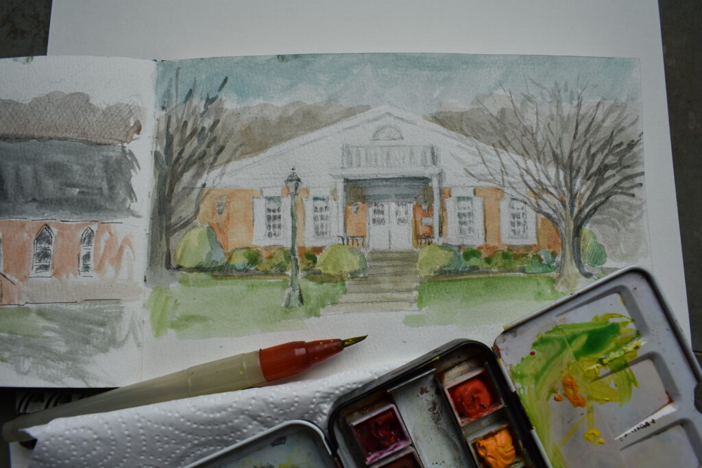 Urban Sketch of the Blossburg Memorial Library by Bibi S. Brion.