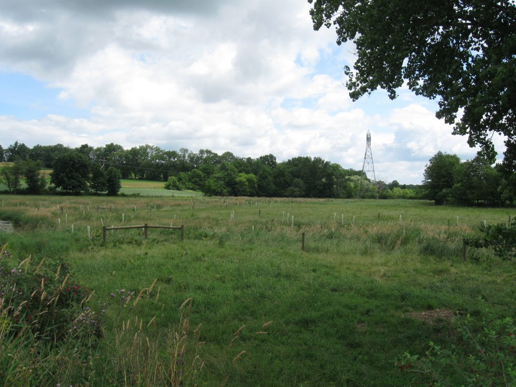 If you pay attention to the overhead transmission line tower, the trees, and the wooden posts used in the fencing project, you’ll get an idea of how much water is in Turtle Creek, and how much Turtle Creek is out of its normal channel.